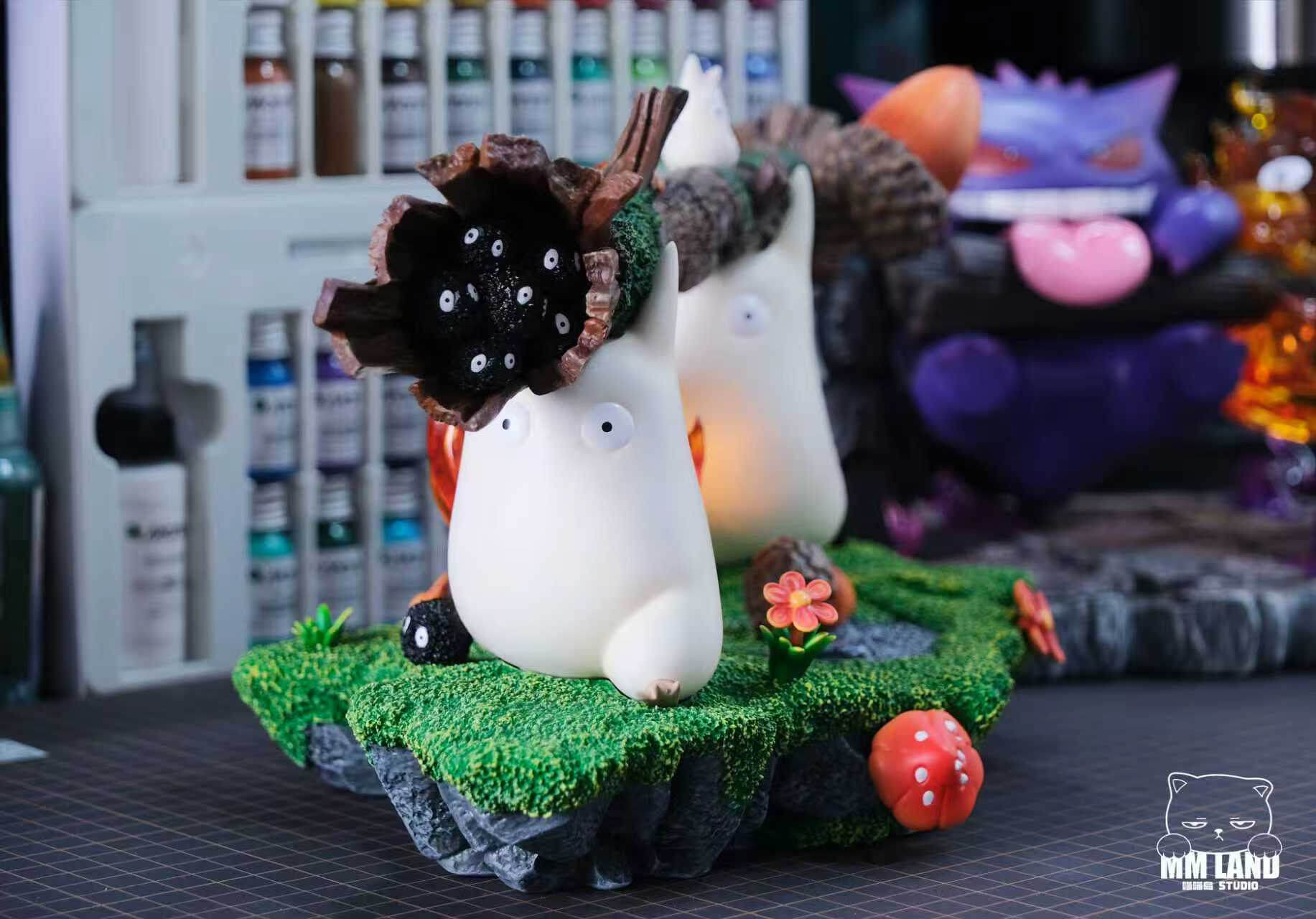 - Naturalistic diorama base โ layered moss terrain, sculpted mushrooms, wildflowers, acorns, and a weathered log suspended between the two Chibi Totoros
