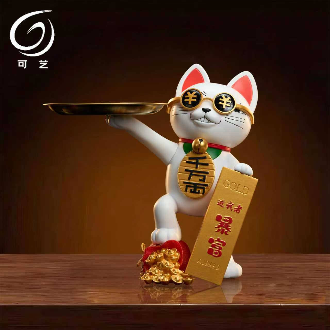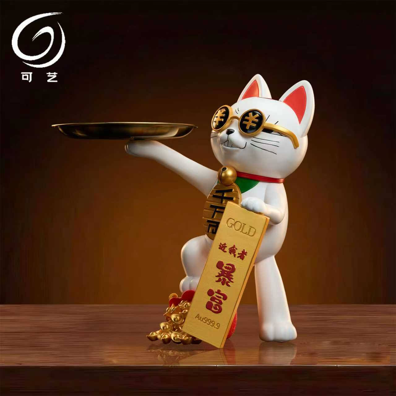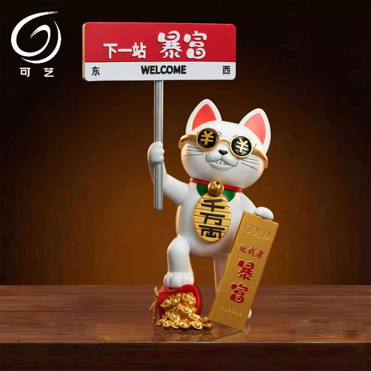 - Money bag and gold ingot base — a plush red drawstring pouch spilling golden ingots at the figure’s feet, grounding the piece in lucky-cat prosperity motifs