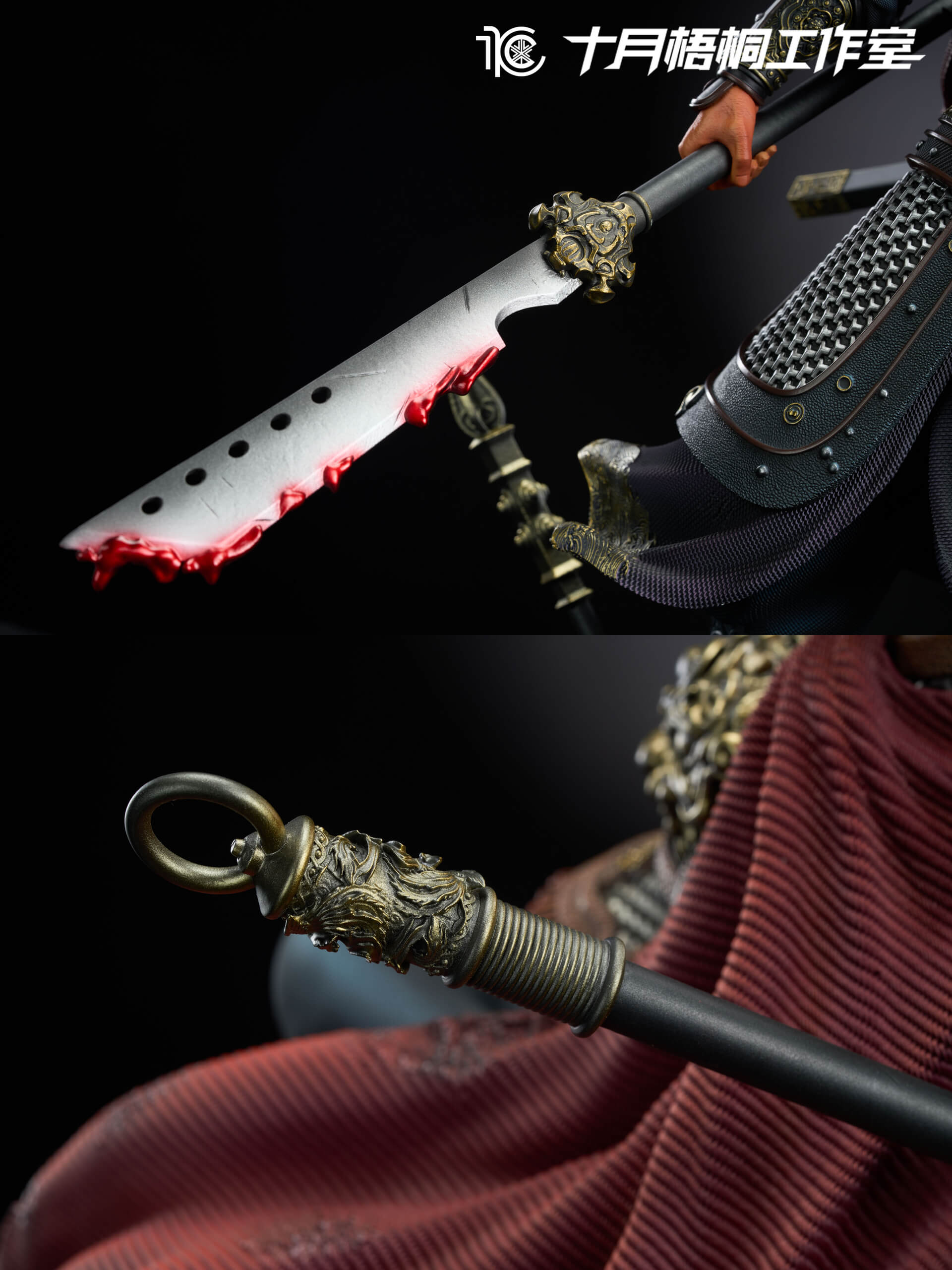 - Primary weapon: large battle dao (chopper-style blade) with blood-effect paint along the edge and detailed gilt guard and pommel โ the kind of finish that rewards close inspection