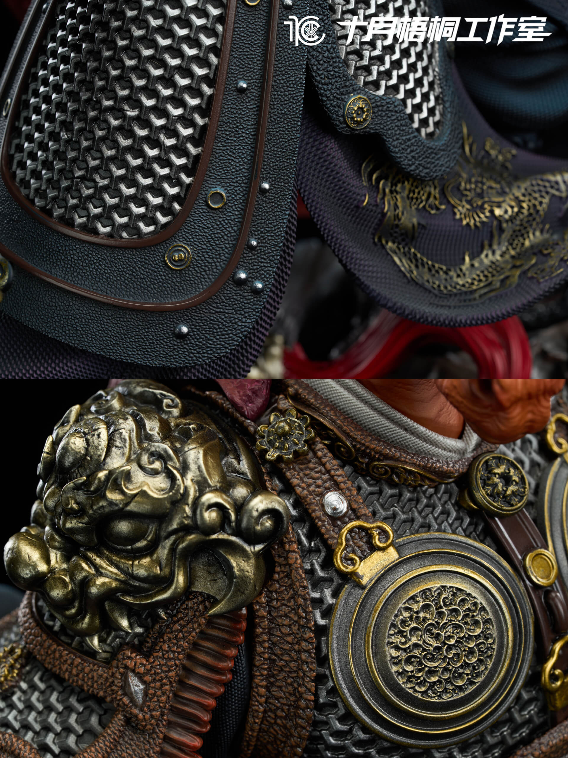 - Sculpted armor details: layered scale-pattern chest plate, lion-head pauldrons with aged bronze patina, engraved cloud-and-dragon motifs on the waist guard, and concentric floral medallions across the torso