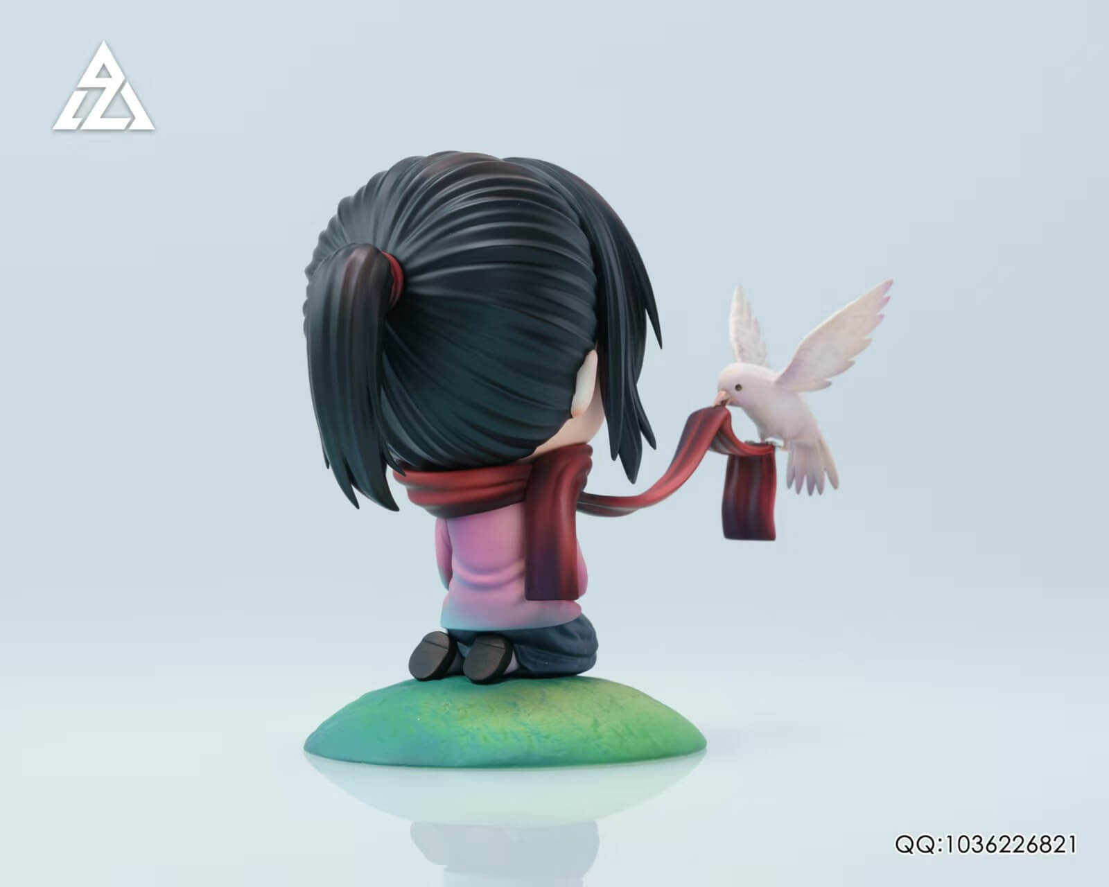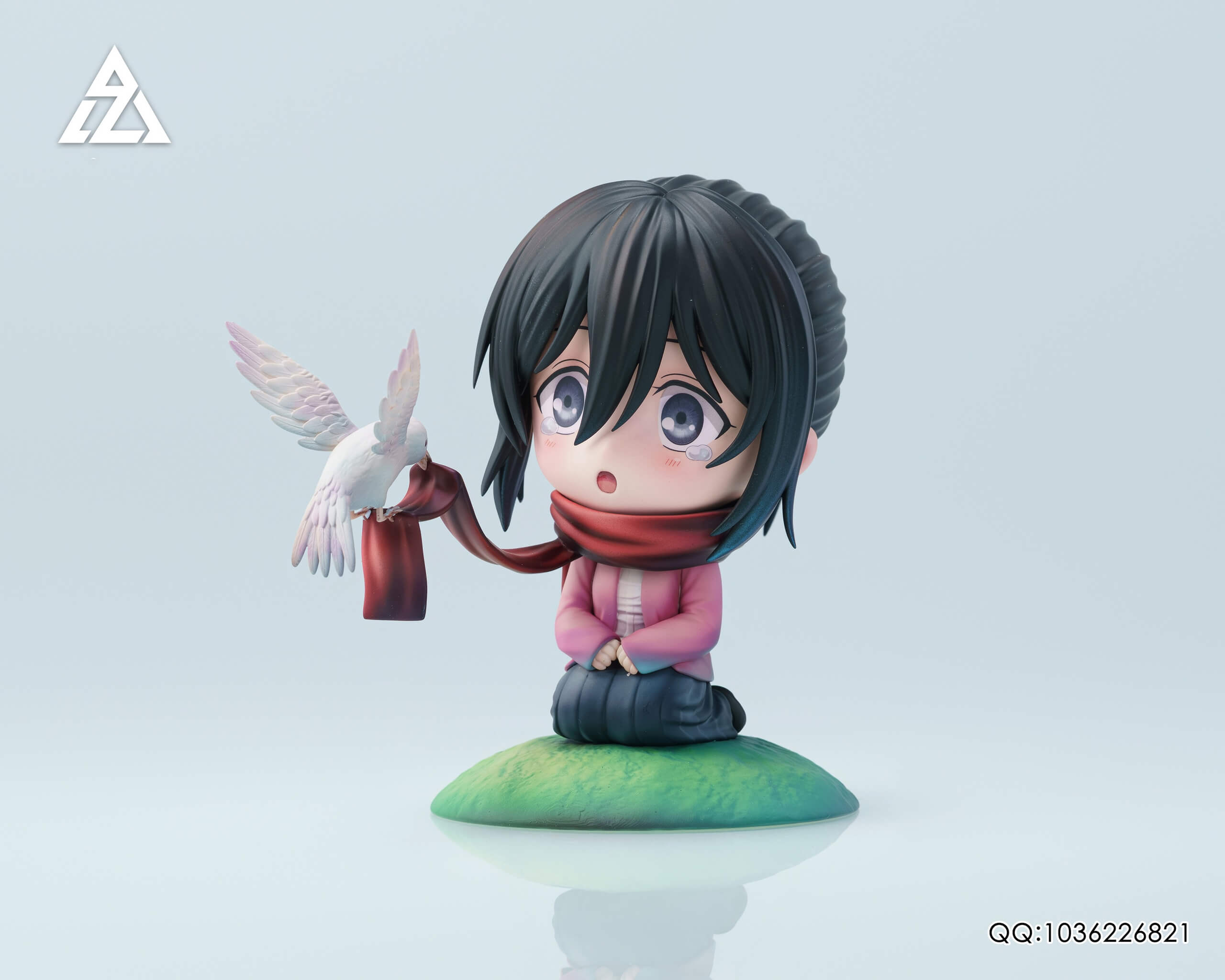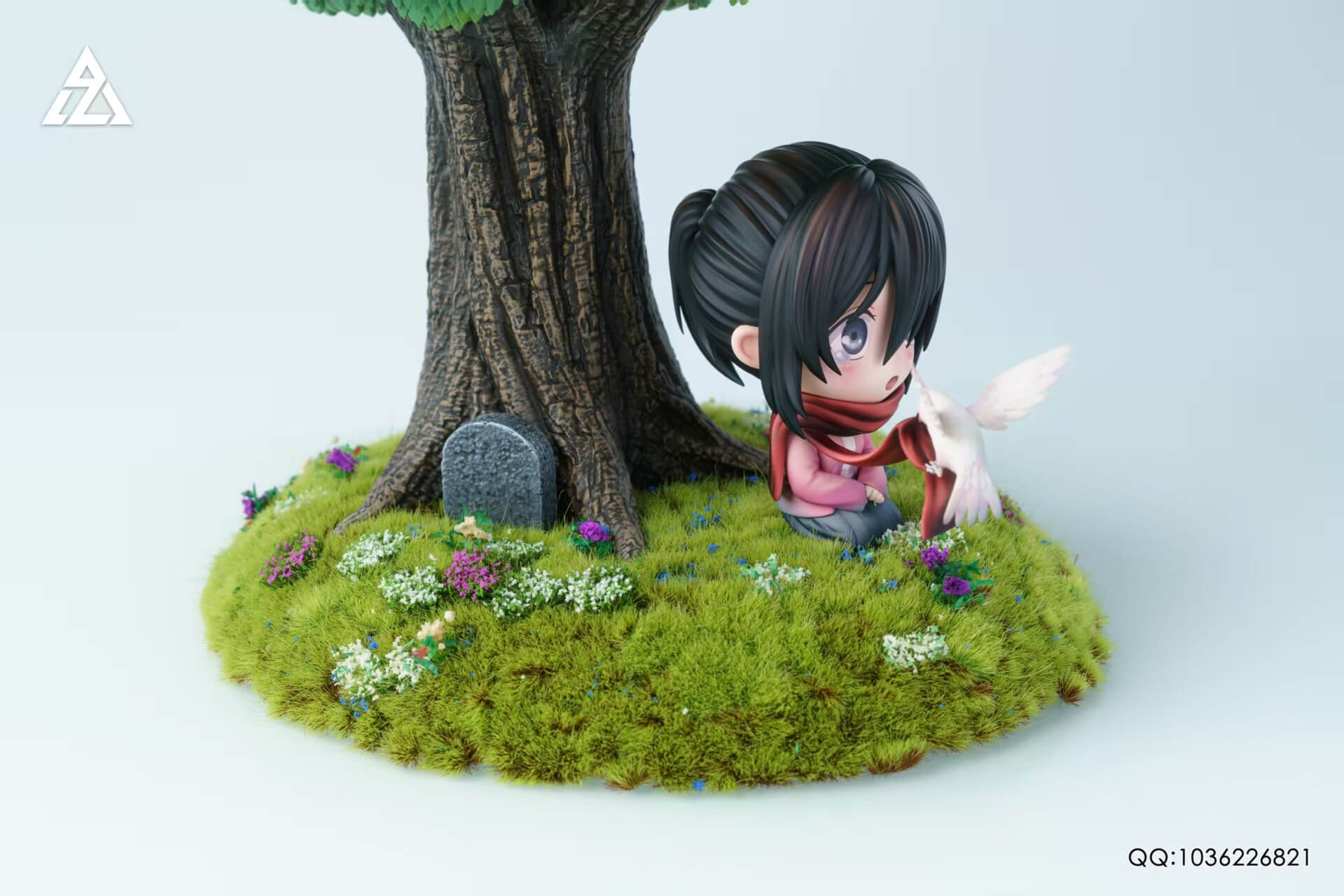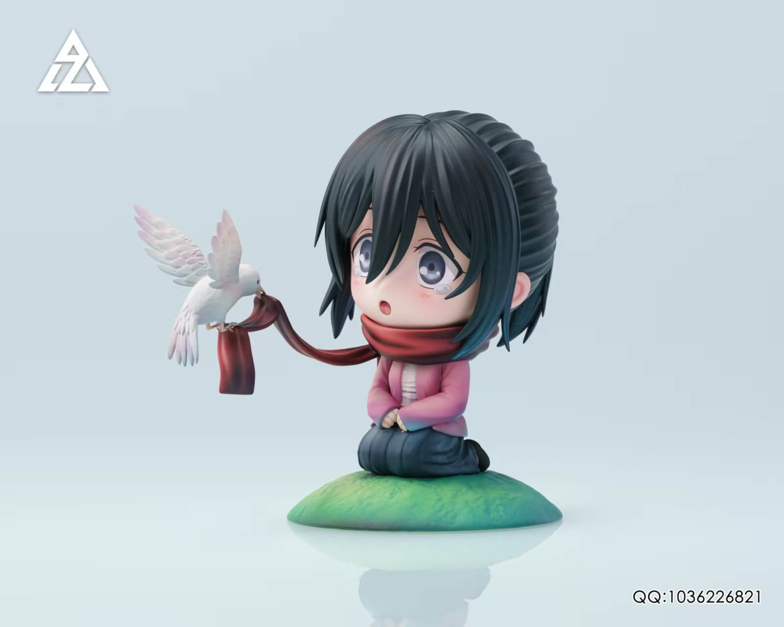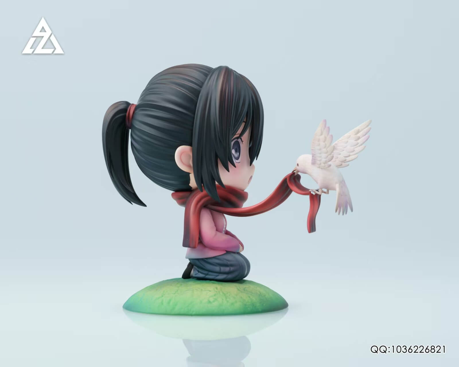 - × 1 Q-version Mikasa figure — kneeling with hands clasped, iconic red scarf trailing into the wind where a white dove perches mid-flight