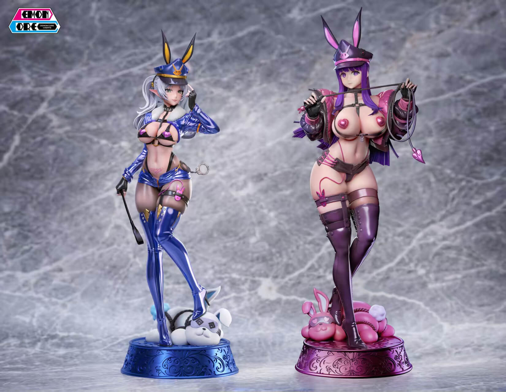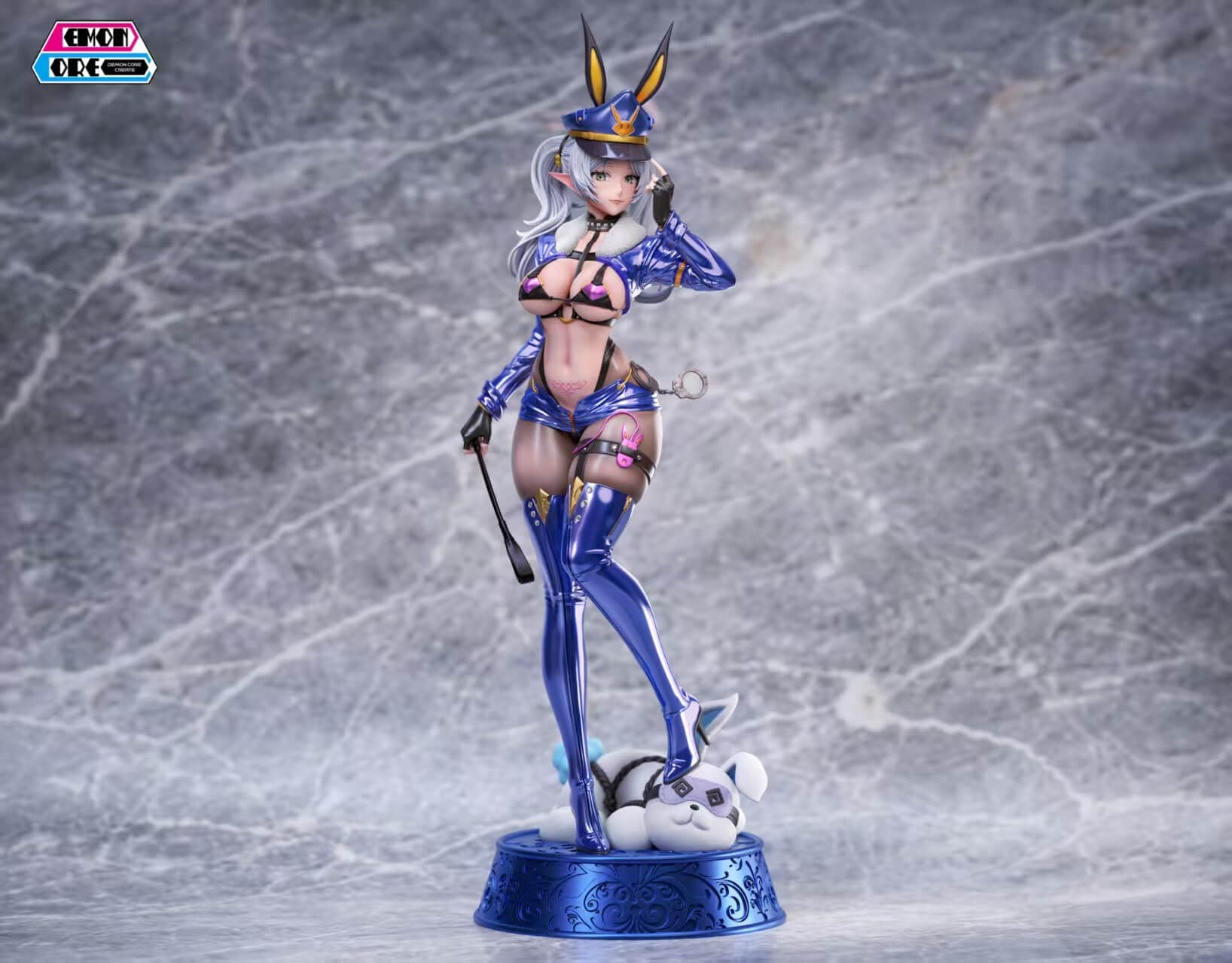 - Ver. A (Frieren) — silver-haired elf rendered in a deep cobalt-blue latex warden uniform with gold trim, rabbit-ear officer cap, sheer black hosiery, thigh harness, and dangling handcuffs at the hip; a braided rear view and sculpted fur collar add layered texture throughout; Frieren’s familiar companion Knot sits restrained at the base, completing the scene