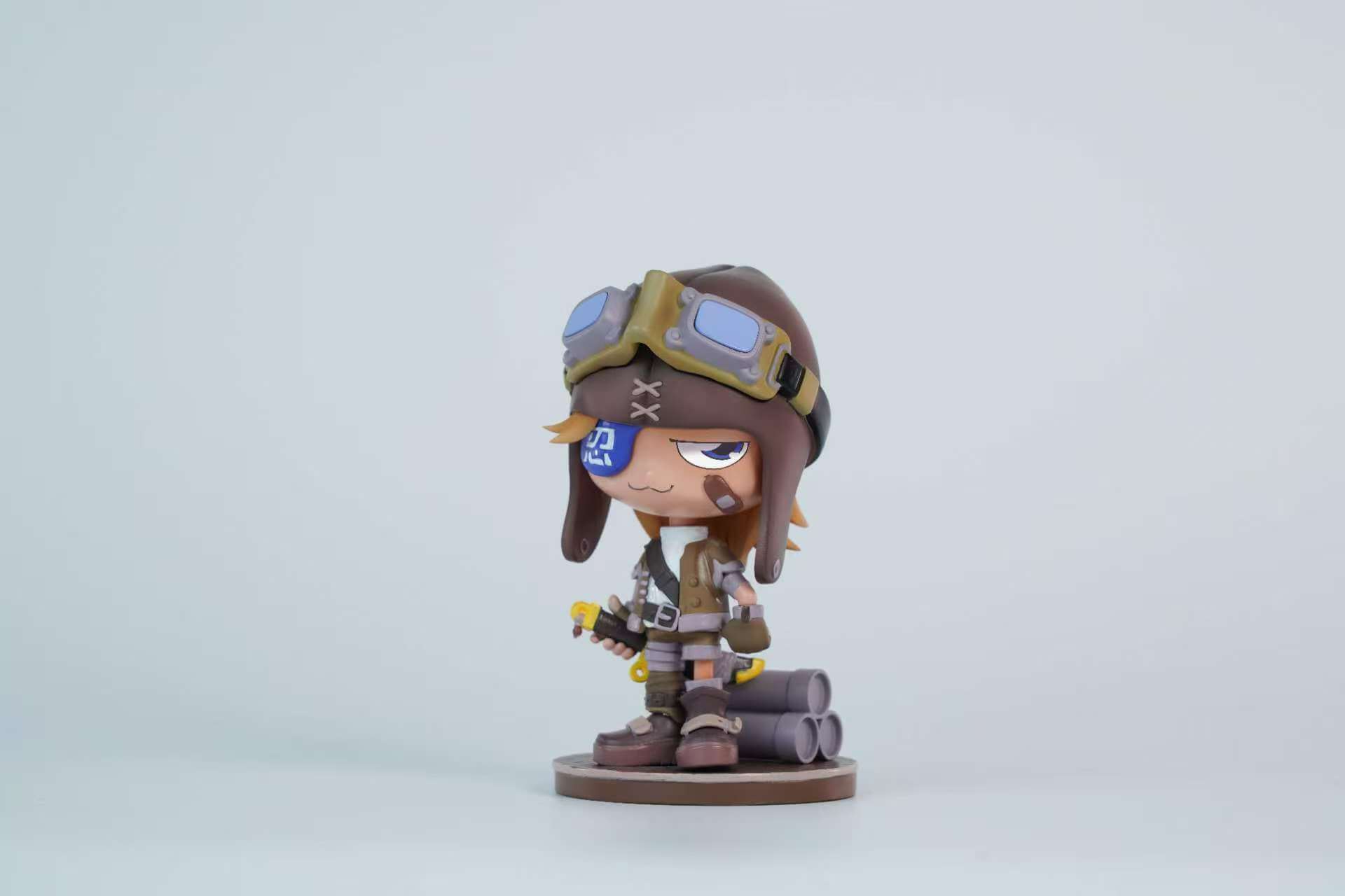 - Detailed pilot-style outfit with jacket, belts, straps, gloves, and boots