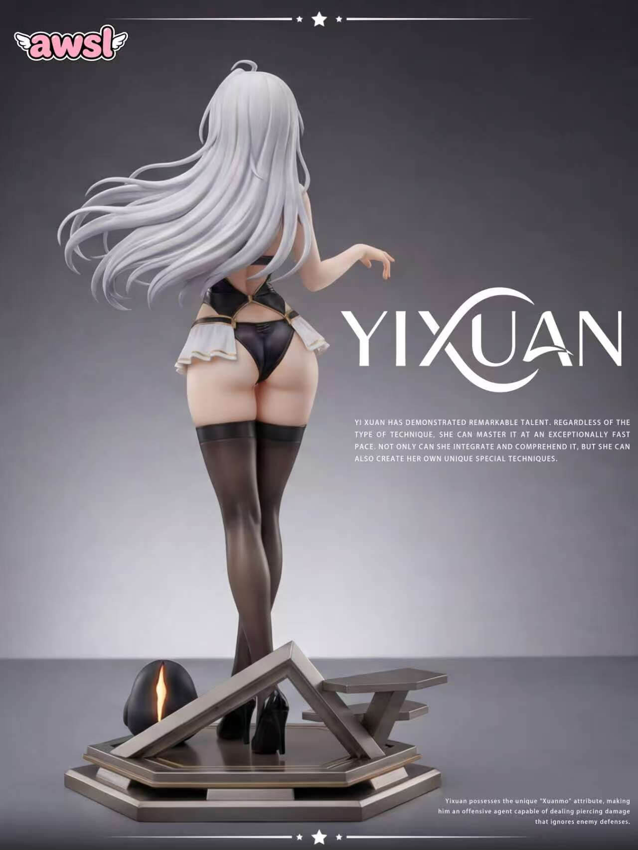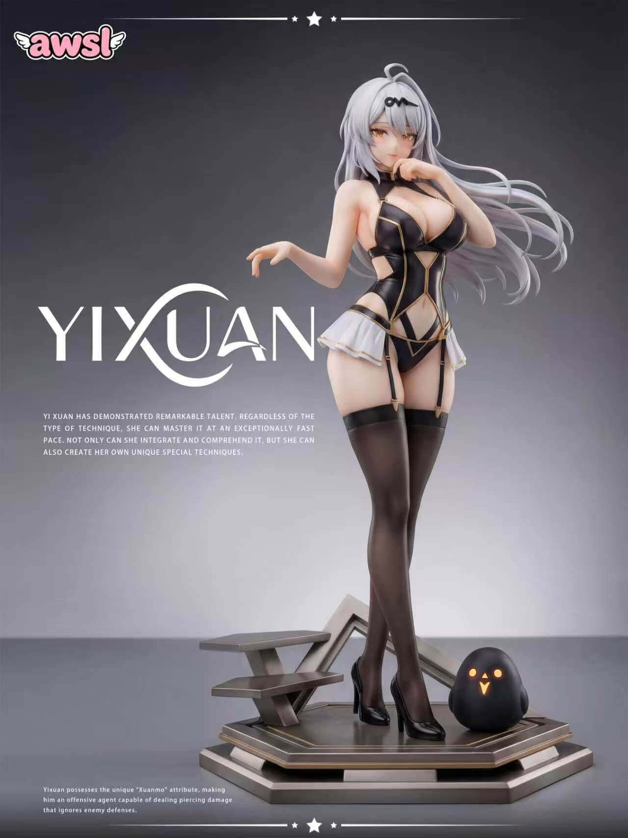 - Full figure of Yixuan in her signature black combat bodysuit with gold trim detailing and white frilled accent skirt