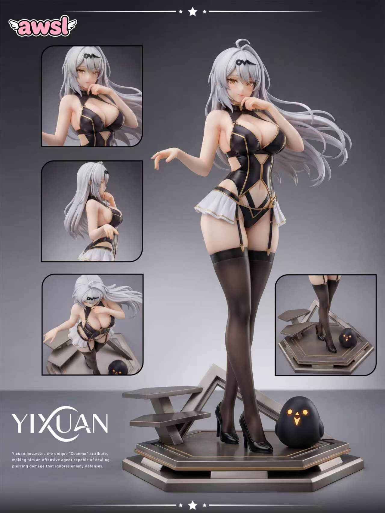 - Companion Bangboo figure rendered in matte black with glowing amber eye detail, positioned on the base as a scene anchor